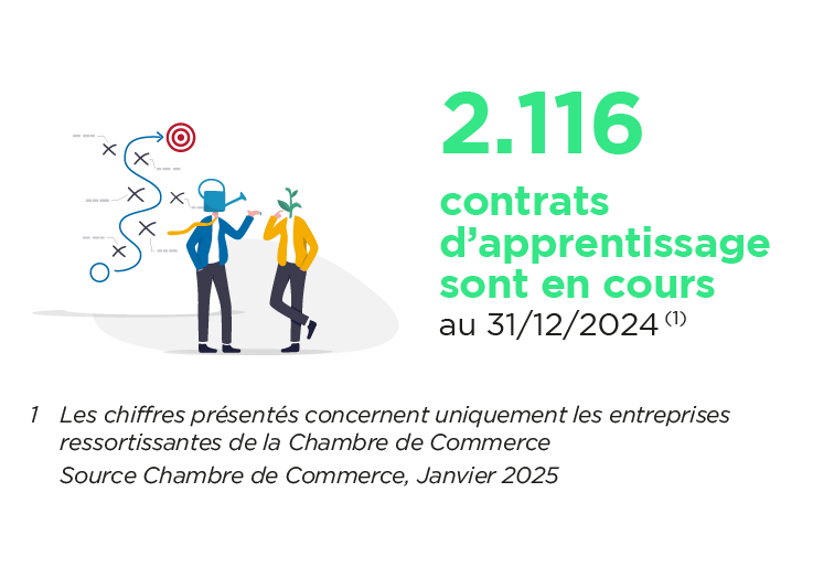 En collaboration avec les autres acteurs de la formation professionnelle initiale, la Chambre de Commerce participe à l’élaboration des programmes de formation professionnelle ainsi qu’à l’organisation de l’apprentissage. Elle gère chaque année près de 2.000 contrats d’apprentissage dans différentes professions des secteurs du commerce, de l’industrie, de l’hôtellerie et de la restauration, des services et du domaine socio-éducatif.